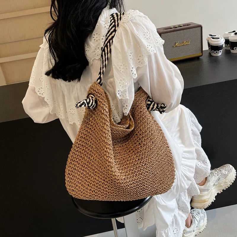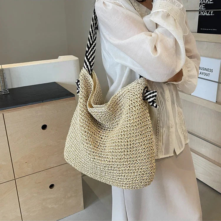- Poignées larges en coton, ornées de rayures délicates, pour un porté épaule confortable et élégant.